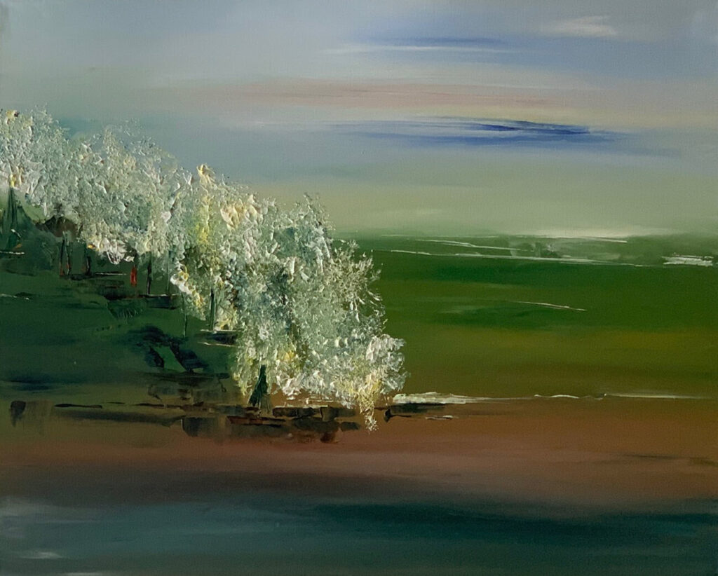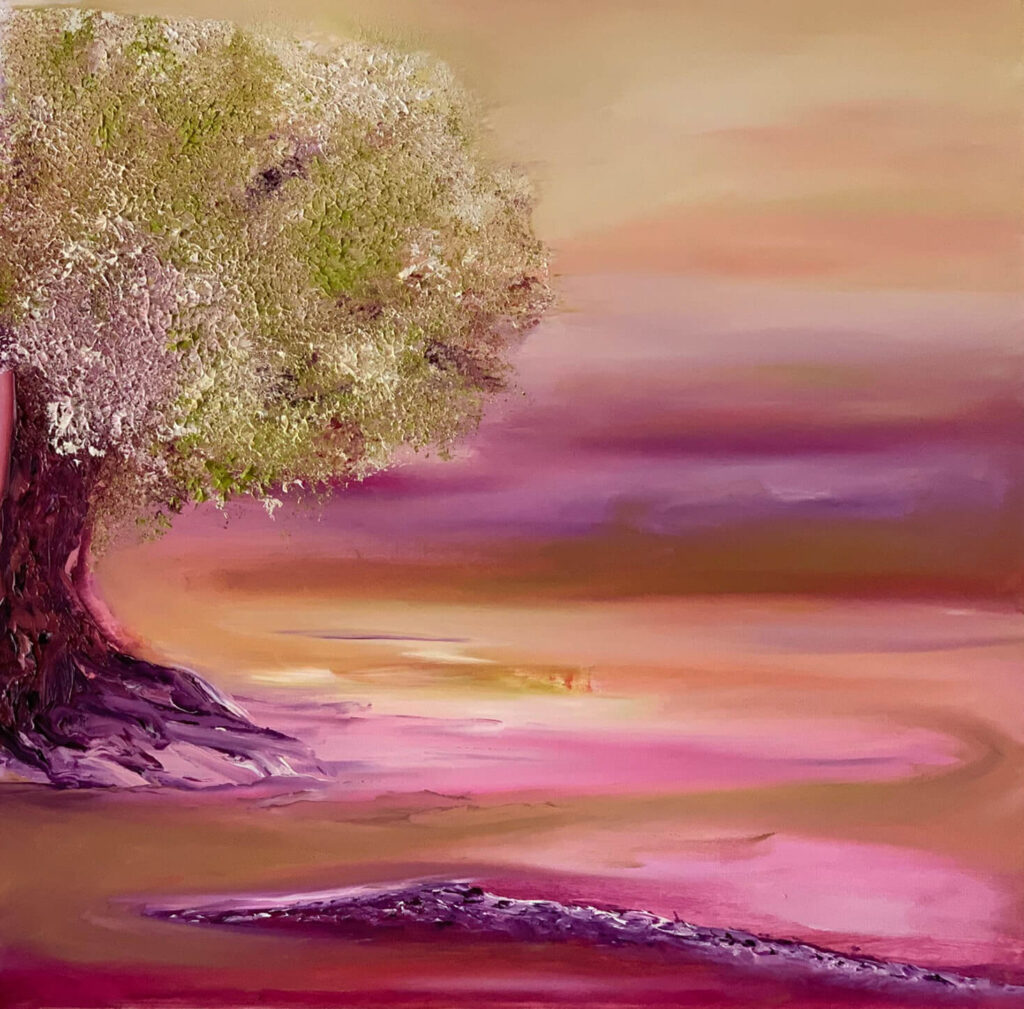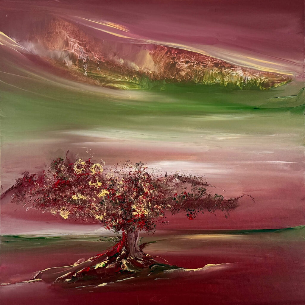 L’arbre aux fruits argentés 1 Sous ses branches, la lumière se pose comme une pluie d’argent. Chaque fruit est un éclat d’ombre et de clarté. L’arbre, témoin silencieux des passages du monde, rappelle que, comme l’écrivait Hafez, « chaque feuille est un livre du divin ».