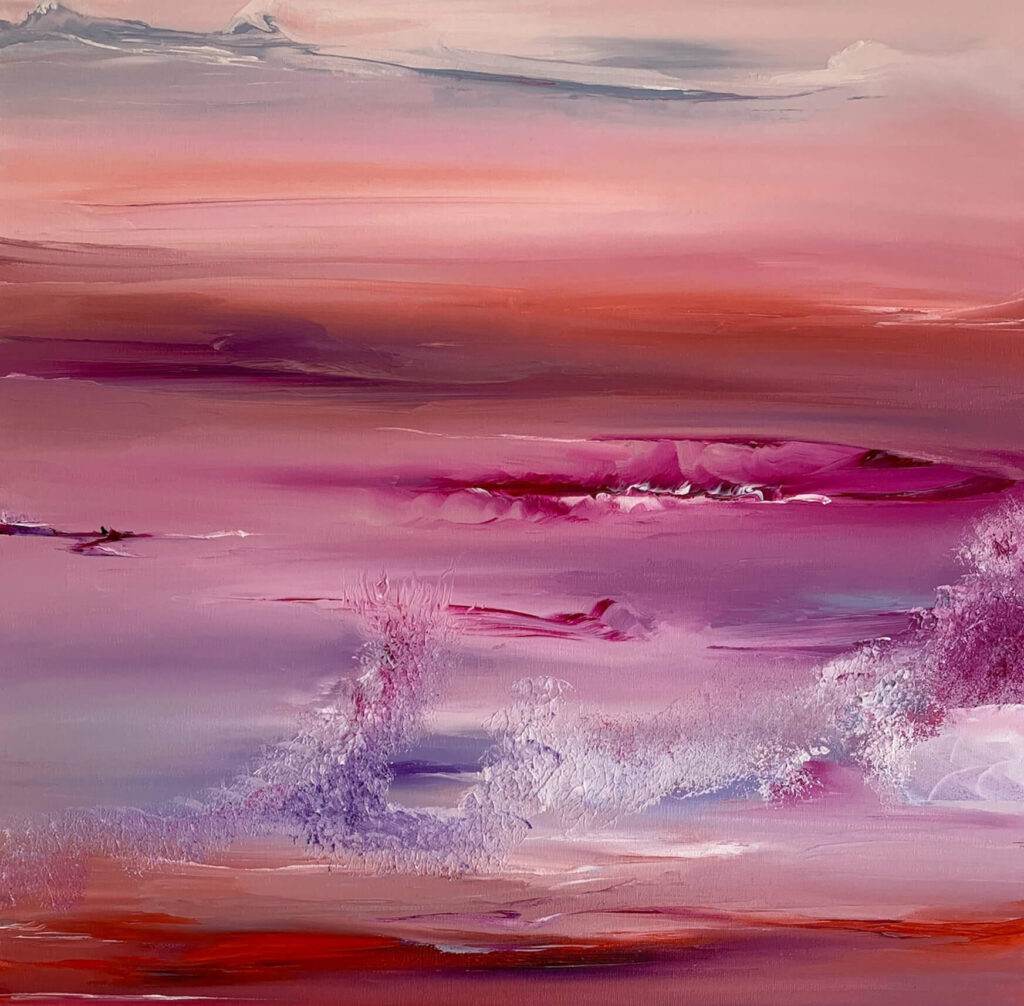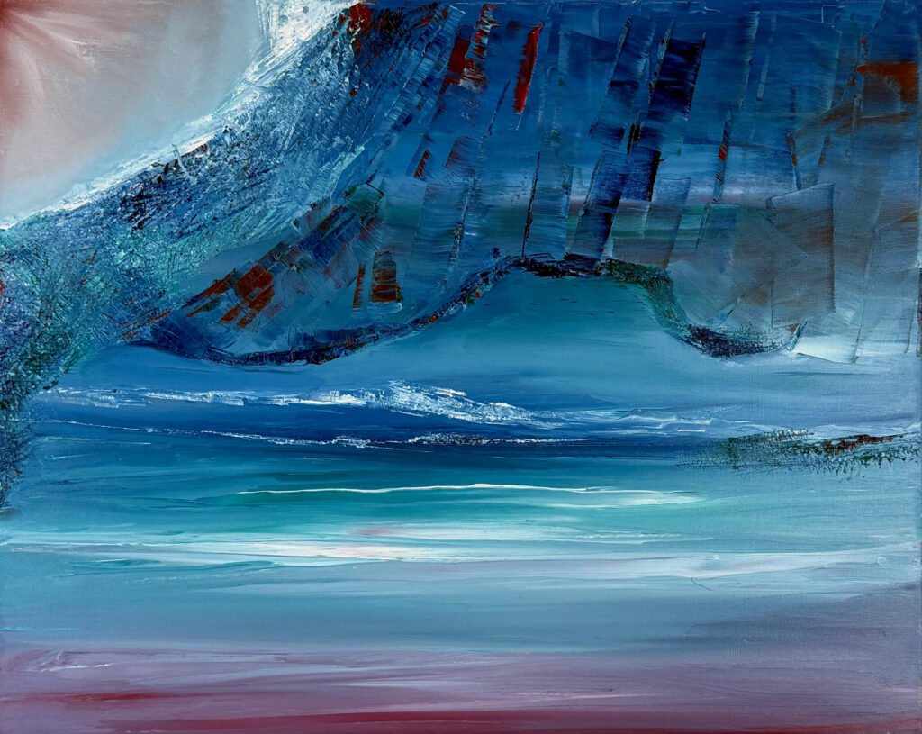 L’Éclat d’océan Chaque toile est une étincelle arrachée à l’immensité. L’océan se fragmente en gouttes de lumière, comme si l’infini acceptait de tenir dans une seule couleur. Rumi nous rappelle : « Tu n’es pas une goutte dans l’océan, tu es l’océan dans une goutte. »